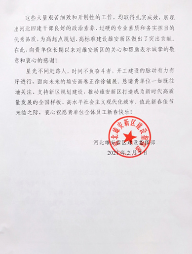 2021年2月下旬,公司收到雄安新區(qū)建設指揮部感謝信,信中就公司對雄安新區(qū)建設的支持幫助表示感謝,對選派到雄安新區(qū)工作的王現(xiàn)峰、孫文超同志給予高度肯定。