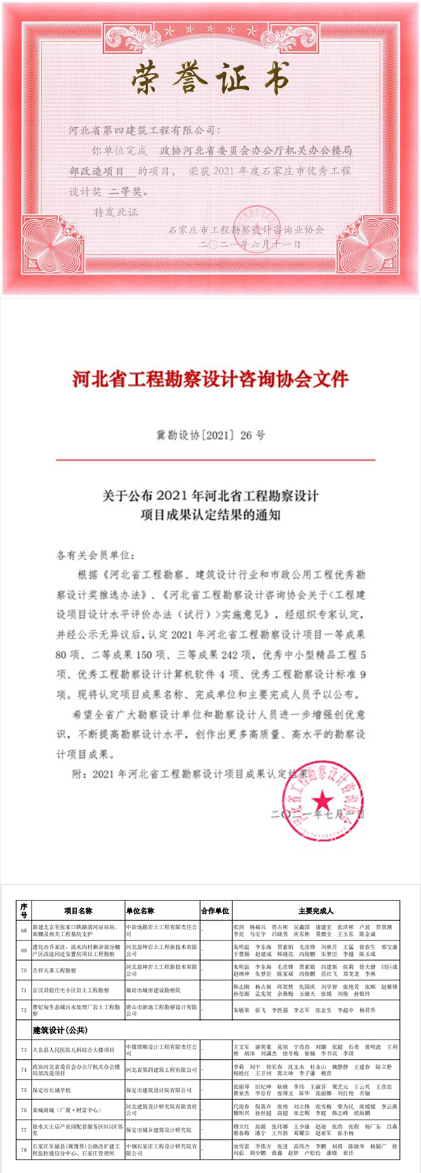 7月5日,公司設(shè)計(jì)院收到榮譽(yù)證書和文件,《政協(xié)河北省委員會(huì)辦公廳機(jī)關(guān)辦公樓局部改造項(xiàng)目》獲2021年石家莊市優(yōu)秀工程設(shè)計(jì)獎(jiǎng)二等獎(jiǎng)、河北省工程勘察設(shè)計(jì)項(xiàng)目成果獎(jiǎng)三等獎(jiǎng)。