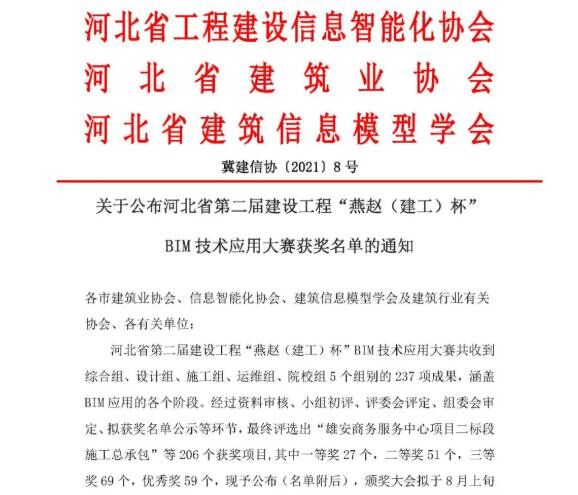7月14日,河北省第二屆建設(shè)工程“燕趙(建工)杯”BIM技術(shù)應(yīng)用大賽獲獎名單揭曉,公司參賽的7項成果全部獲獎,其中一等獎2項、二等獎2項、三等獎3項。