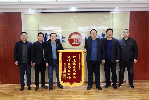 2022年1月7日上午,滄州滄海明珠旅游開(kāi)發(fā)有限公司副總經(jīng)理姬新強(qiáng)、項(xiàng)目推進(jìn)辦主任楊龍生一行人專(zhuān)程從滄州來(lái)到公司,感謝公司保節(jié)點(diǎn)、高質(zhì)量地完成施工任務(wù),并鄭重地將寫(xiě)有“四建鐵軍筑精品 誠(chéng)信履約贏市場(chǎng)”的錦旗送到公司黨委副書(shū)記、總經(jīng)理唐志強(qiáng)手中。公司副總經(jīng)理張新煜、三分公司經(jīng)理李書(shū)偉一同接待了姬新強(qiáng)一行。