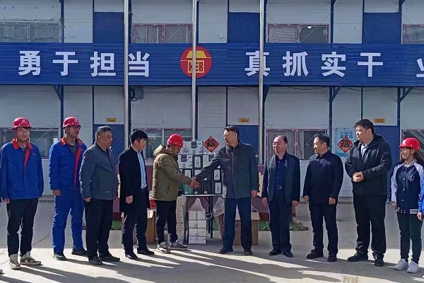 在會(huì)議室,唐志強(qiáng)聽取了項(xiàng)目基本情況匯報(bào),詳細(xì)了解職工生產(chǎn)生活、勞動(dòng)防護(hù)等方面情況。隨后深入施工現(xiàn)場(chǎng),查看職工工作環(huán)境并與職工交流,傾聽一線職工聲音。C型料場(chǎng)正在進(jìn)行擋墻主體施工,他叮囑現(xiàn)場(chǎng)管理人員高度注意安全,防止高空墜落。來(lái)到項(xiàng)目辦公區(qū),院內(nèi)墻壁上“誠(chéng)信守責(zé)、勇于擔(dān)當(dāng)、真抓實(shí)干、業(yè)績(jī)服人”的工作總要求顯得格外醒目,“大家遠(yuǎn)離家鄉(xiāng),在一線兢兢業(yè)業(yè),工作辛苦了,我代表公司工會(huì)來(lái)看望你們……”他向每位職工送上保溫杯、牛奶等慰問(wèn)品,“內(nèi)蒙古風(fēng)沙大,最近天氣冷,大家一定要注意保暖……”他和職工一一握手問(wèn)好,并送上殷切關(guān)懷。
