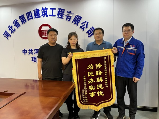 “感謝河北四建對鎮(zhèn)政府工作的大力支持,解決了桃園鎮(zhèn)學(xué)府聯(lián)合社區(qū)前進村與滹沱河河堤路之間的道路損壞嚴重的大問題……”6月5日下午,石家莊市長安區(qū)桃園鎮(zhèn)人民政府代表琚紅珊帶著濃濃的謝意專程來到九分公司中共河北省委黨校項目部,將“為民辦實事 修路解民憂”的錦旗交到分公司黨總支書記、經(jīng)理劉喜良手里,對河北四建公司的大力支持和幫助表示誠摯感謝。