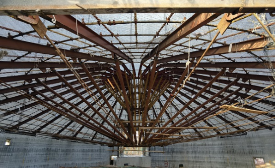 體系設(shè)計優(yōu)化,拼裝提速?!颁摻罨炷镣矀}錐殼頂板架空支撐施工工法”依托糧食類筒倉工程,筒倉建筑高度高達(dá)50米,內(nèi)徑26米,倉頂設(shè)計為錐殼頂、平頂雙層結(jié)構(gòu),斜錐殼板厚0.2米。以往筒倉倉壁一般采用滑模施工,錐殼頂板施工復(fù)雜,一般采用H型鋼組裝成圓柱形核心筒、外輻射鋼桁架平梁的方式組裝成支撐平臺,重21.9噸,用鋼量大,制作成本高;節(jié)點連接采用焊接,拼裝速度慢,無法滿足群體筒倉的周轉(zhuǎn)時效。分公司針對傳統(tǒng)做法的弊端,組織科研小組,專項研究,破解難題,最終形成了空間鋼桁架——拉索組合結(jié)構(gòu)支撐體系。該體系摒棄了3.2米直徑的圓柱型核心筒,采用直徑2.6米的傘狀中心筒,通過五道環(huán)梁環(huán)向拉接,無需設(shè)置斜撐,原結(jié)構(gòu)減輕將近1噸,節(jié)約了制作成本,而且承壓能力更強(qiáng)。重點節(jié)點還改用了高強(qiáng)螺栓連接代替焊接,拼裝速度明顯提升,施工速度更快。