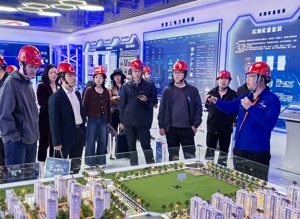 在智能建造指揮中心,項目技術(shù)總工向觀摩團介紹了公司基本情況、工程概況,重點圍繞項目智慧工地系統(tǒng),講解了物聯(lián)監(jiān)測、安全管理、質(zhì)量管理、項目進度、360度全景等8大模塊內(nèi)容。項目部設(shè)立了智慧工地管理平臺,將項目進度、質(zhì)量、安全、勞務(wù)等各方面數(shù)據(jù)集中統(tǒng)一管理,方便了管理人員科學(xué)分析與決策;安裝了塔吊在線監(jiān)測、吊鉤盲區(qū)可視化系統(tǒng),保障吊裝安全,提高了作業(yè)效率;應(yīng)用了揚塵噪聲在線監(jiān)測、遙控器控制揚塵噴霧等智能系統(tǒng),有效控制了揚塵污染……一系列實際應(yīng)用及效果圖片,充分展示了項目高質(zhì)量、智慧化建設(shè)水平,觀摩人員紛紛拿起手機拍照記錄。