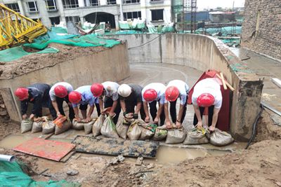 防汛演練緊貼實(shí)際。首先項(xiàng)目部按照預(yù)定方案和針對(duì)現(xiàn)場(chǎng)地形,最容易產(chǎn)生積水的車庫(kù)成為了此次防汛的重點(diǎn)搶險(xiǎn)位置。在演練過(guò)程中于立功以身作則,沖在防汛最前面,帶領(lǐng)工人扛沙袋,設(shè)置警戒線,在車庫(kù)入口做好擋水墻;現(xiàn)場(chǎng)臨電電工接通電線,啟動(dòng)移動(dòng)水泵等搶險(xiǎn)設(shè)備抽排積水;清淤小組打開(kāi)雨水篦進(jìn)行人工助排,快速清理路面淤泥垃圾等,搶險(xiǎn)現(xiàn)場(chǎng)各項(xiàng)工作井然有序進(jìn)行。演練過(guò)程中全體人員士氣高昂、配合默契、銜接流暢,圓滿地完成了防汛應(yīng)急演練。