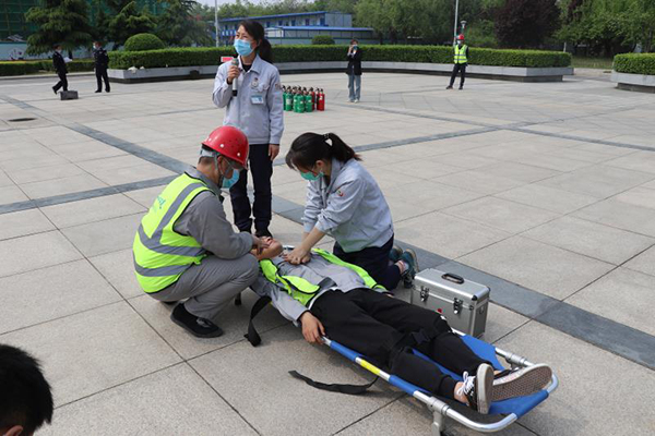 上午10點,消防救援支隊講解員對全體人員進行消防安全知識培訓,詳細講解了防煙面罩正確佩戴方法、疏散逃生要領,以及滅火器的使用方法和注意事項。10點半左右,演練正式開始,施工現(xiàn)場三區(qū)二層濃煙滾滾,“著火了,著火了¨¨¨”項目安全員在現(xiàn)場巡查時發(fā)現(xiàn)火情高聲呼喊,周圍施工人員迅速拿滅火器進行滅火,項目經(jīng)理張玉賓接到險情后馬上通知義務消防隊員滅火并組織緊急疏散。大家用濕毛巾捂住口鼻,俯身低頭按照演練逃生路線快速從現(xiàn)場撤離到演練集合區(qū)。在大家撤離火災現(xiàn)場的同時,救援組孫杰、楊克、董擁軍等人把傷員抬到通風處,他們在醫(yī)療救護組的指導下,用雙手拍打傷者雙肩并呼叫他的名字、用觸摸頸動脈等方法斷傷者是否喪失意識,并進行心肺復蘇。心肺復蘇演練時,按壓胸部是最有效也是最常用的辦法,施救人員首先在傷者兩乳頭連線中間,胸骨中下三分之一處找準按壓點,然后用手掌根部緊貼傷者胸部,兩手重疊,五指相扣,手指翹起,肘關節(jié)伸直,用上身重量垂直下壓30次,經(jīng)過救治傷者最終蘇醒,整個搶救過程有條不紊,最后藁城區(qū)消防救援大隊長張海寧對應急預案演練進行了點評,此次火災應急預案演練圓滿結(jié)束。