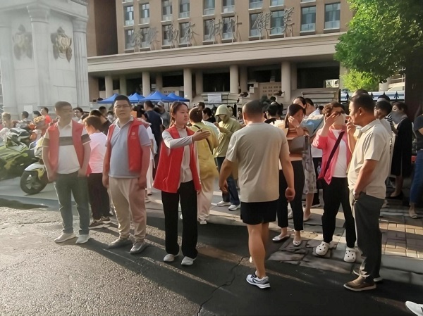 動態(tài)響應(yīng)服務(wù),溫暖考場周邊。8日上午,當(dāng)一位老大爺騎著一輛載有文具的三輪車在校門口準(zhǔn)備打開手持喇叭時,負(fù)責(zé)入口引導(dǎo)的志愿者立即上前,輕聲勸說其暫時關(guān)閉喇叭,并引導(dǎo)其停靠在指定區(qū)域。9日下午,突降陣雨,一位騎車人突然在校門口滑倒,正在執(zhí)勤的2名分公司志愿者迅速過去查看,詳細(xì)詢問駕駛?cè)藗?,小心將其扶起,并陪同至志愿服?wù)亭進(jìn)行簡單處理,同時將占道的電動車推到便道上,保障道路暢通。這些暖心瞬間,讓家長們倍感安心,也充分展現(xiàn)了志愿者們的責(zé)任與擔(dān)當(dāng)。