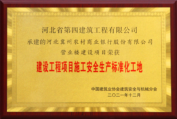 2021年12月22日,公司收到中國建筑業(yè)協(xié)會安全與機械分會下發(fā)的文件,我公司施工的河北冀州農(nóng)村商業(yè)銀行股份有限公司營業(yè)樓建設(shè)項目喜獲全國安全生產(chǎn)標(biāo)準(zhǔn)化工地,這是公司第9次獲得此項榮譽。