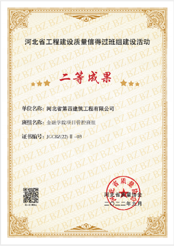 9月16日,六分公司收到了河北省質(zhì)量協(xié)會頒發(fā)的證書,河北金融學院項目管控班組榮獲“河北省工程建設質(zhì)量信得過班組建設活動”二等成果,并被推薦到中國建筑業(yè)協(xié)會交流。