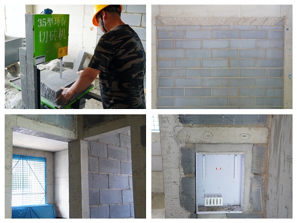 在材料利用與成本控制方面,項目團(tuán)隊探索出了“更優(yōu)解”。針對頂部斜砌施工,項目部原計劃采購混凝土預(yù)制塊進(jìn)行砌筑,但在論證中發(fā)現(xiàn)采購的預(yù)制塊存在成本高、運輸損耗大、工序銜接慢等弊端。經(jīng)過反復(fù)研討,項目團(tuán)隊決定就地取材,利用現(xiàn)場加氣混凝土砌塊施工剩余的裁切廢料,通過定型化切割模具進(jìn)行精準(zhǔn)切割,替代外購預(yù)制塊。為保障方案順利實施,項目部提前抽調(diào)技術(shù)嫻熟的切割工,組織加氣塊切割專項培訓(xùn),同時提前安裝調(diào)試好40余臺高精度切割設(shè)備,現(xiàn)場切割作業(yè)得以高效展開。這一創(chuàng)新方法的運用,將加氣塊材料的現(xiàn)場利用率提高到90%以上,其切割面更加平整,有效保障了斜砌質(zhì)量和結(jié)構(gòu)整體性,提升了觀感效果。