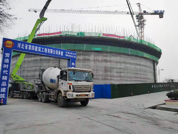 熟料儲存及輸送筒倉直徑60米,高20.5米。1月11日,業(yè)主項(xiàng)目負(fù)責(zé)人王利杰組織召開專題會議,鄭重要求1月20日前滑模施工必須完成。面對業(yè)主早日投產(chǎn)的殷切期盼,項(xiàng)目部緊急組織施工策劃,明確搶進(jìn)度措施辦法,全體動員,多點(diǎn)發(fā)力,全力以赴?;J┕ぁT趧訂T會上,成立了以項(xiàng)目經(jīng)理為組長的滑模領(lǐng)導(dǎo)小組,班子帶班,明確責(zé)任目標(biāo);與作業(yè)班組簽訂安全、質(zhì)量承諾書,增強(qiáng)其責(zé)任意識;購置鋼筋間距測量設(shè)備,節(jié)省驗(yàn)收鋼筋工程時(shí)間和人力。由于疫情原因,現(xiàn)場勞力不能迅速到位,項(xiàng)目部提前組織管理人員晚上加班吊運(yùn)鋼筋、水泥、腳手板等材料,大家高漲的干勁兒在滑?,F(xiàn)場起到了積極的帶動作用。庫壁預(yù)應(yīng)力鋼絞線設(shè)置較為密集,每間隔26厘米一道,而且?guī)в腥嵝?,往庫壁鋼筋?nèi)穿設(shè)時(shí)容易跑偏,工作效率低。為加快施工,技術(shù)人員巧妙地在庫壁鋼筋上加設(shè)了U型鋼筋固定鋼絞線穿行位置,然后大家一字排開,“一二、一二……”齊聲喊著口號,有節(jié)奏地用力將鋼絞線在庫壁鋼筋里穿行直到扶壁柱。數(shù)九隆冬的夜間滑模平臺上氣溫很低,但是大家的工作熱情不減,干勁不退,抬鋼筋、綁鋼筋、穿鋼絞線……,干得熱火朝天,沒有人叫苦喊累,在大家的共同努力下,滑模以每天2.7米的速度快速推進(jìn)。