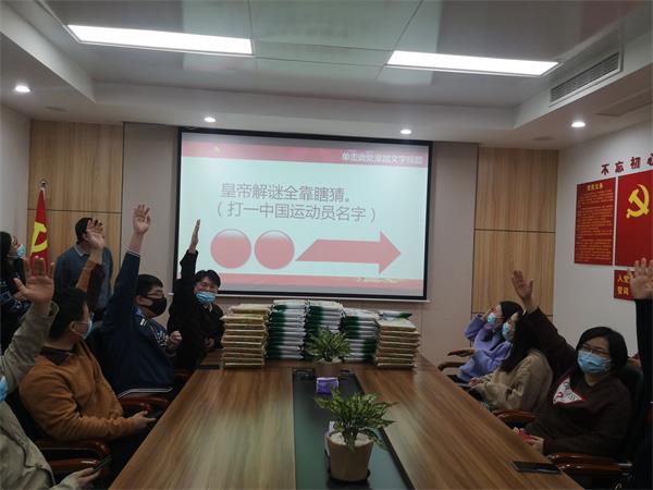 “正月十五貼對(duì)聯(lián),打一北京冬奧比賽場(chǎng)地?!贝笃聊粍傄环_(kāi),職工們紛紛參與競(jìng)答,司南第一個(gè)站起來(lái)說(shuō):“是崇禮”,梁靖昆馬上跟上說(shuō):“你說(shuō)的不對(duì),應(yīng)該是延慶”,組織者說(shuō):“梁靖昆答對(duì)了,發(fā)獎(jiǎng)品”?!罢f(shuō)上兩句趕緊溜,打一冬奧比賽項(xiàng)目。”只見(jiàn)李天昊站起來(lái)說(shuō):“是短道速滑,2月7日,任子威獲得了北京冬奧會(huì)短道速滑男子1000米冠軍,實(shí)現(xiàn)了中國(guó)隊(duì)在該項(xiàng)目上冬奧金牌零的突破??次疫@大長(zhǎng)腿,也非常適合這個(gè)項(xiàng)目。”大家哄然大笑?!按饘?duì)了,發(fā)獎(jiǎng)品?!彪S著獎(jiǎng)品的不斷發(fā)放,大家的熱情更高了,展開(kāi)了更加激烈的角逐,活動(dòng)現(xiàn)場(chǎng)精彩紛呈、高潮迭起,充滿了活力和趣味?;顒?dòng)結(jié)束后,組織人員還為每名職工發(fā)放了湯圓。
