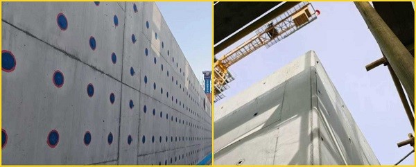紅藍(lán)標(biāo)識打造“秩序之美”,破解外墻防水難題。地下室外墻防水是工程施工重點(diǎn),直接關(guān)系居民居住質(zhì)量。項(xiàng)目部采用三段式止水螺桿替代傳統(tǒng)通絲螺桿,中間段留置墻內(nèi)形成止水屏障,兩端錐形頭可拆除,形成規(guī)整錐形坑。項(xiàng)目部創(chuàng)新采用紅藍(lán)圓形防水涂料封堵工藝,經(jīng)螺桿眼清理、砂漿封堵、分層精準(zhǔn)涂刷等工序,以螺桿眼為圓心交替涂刷紅、藍(lán)涂料,形成整齊矩陣。原本普通的螺桿孔洞變身外墻“紐扣”陣列,既展現(xiàn)工業(yè)秩序之美,又實(shí)現(xiàn)防水質(zhì)量可視化管控,從源頭杜絕了滲漏隱患。